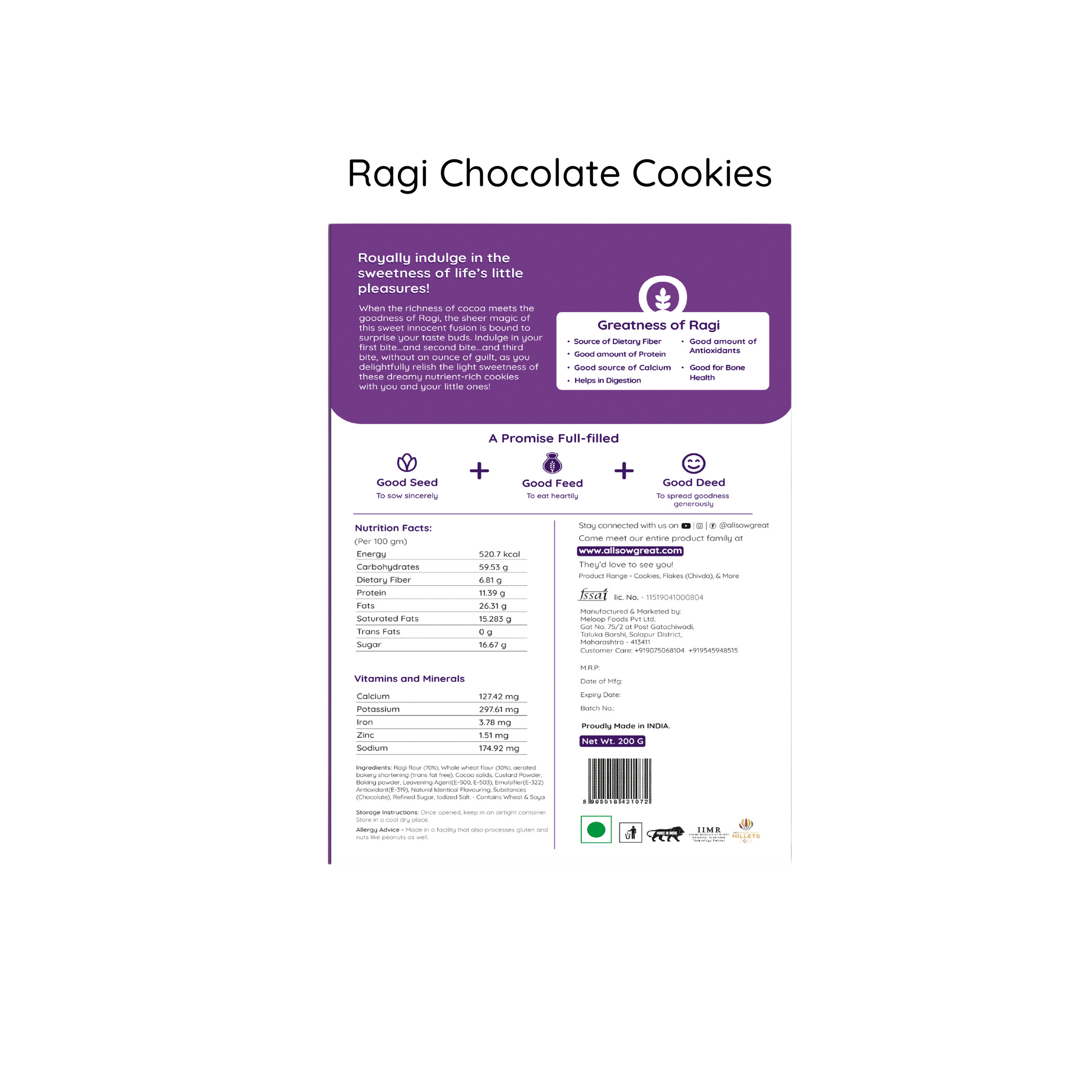Guilt-Free, No Maida Millet Cookie Indulgence! Enjoy the wholesome goodness of All Sow Great Ragi Chocolate Cookies. A delicious fusion of calcium-rich ragi (finger millet) and real chocolate, baked without any maida. Satisfy your mid-day hunger or chocolate cravings. All Sow Great Ragi Chocolate Cookies deliver crunchy, nutritious joy with every bite. Perfect as lunchbox snacks, tea-time treats.